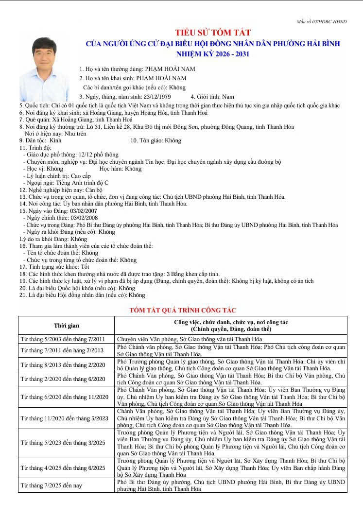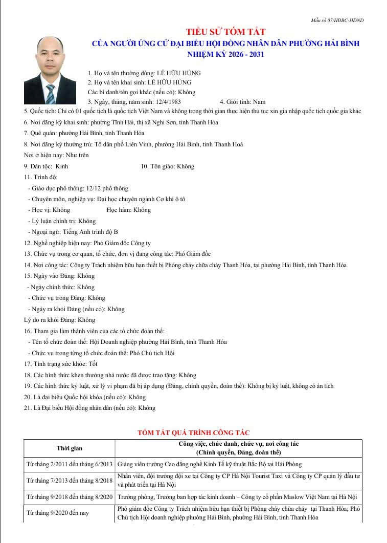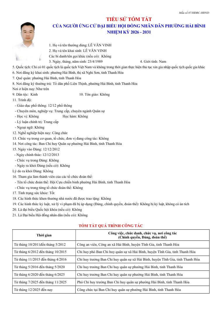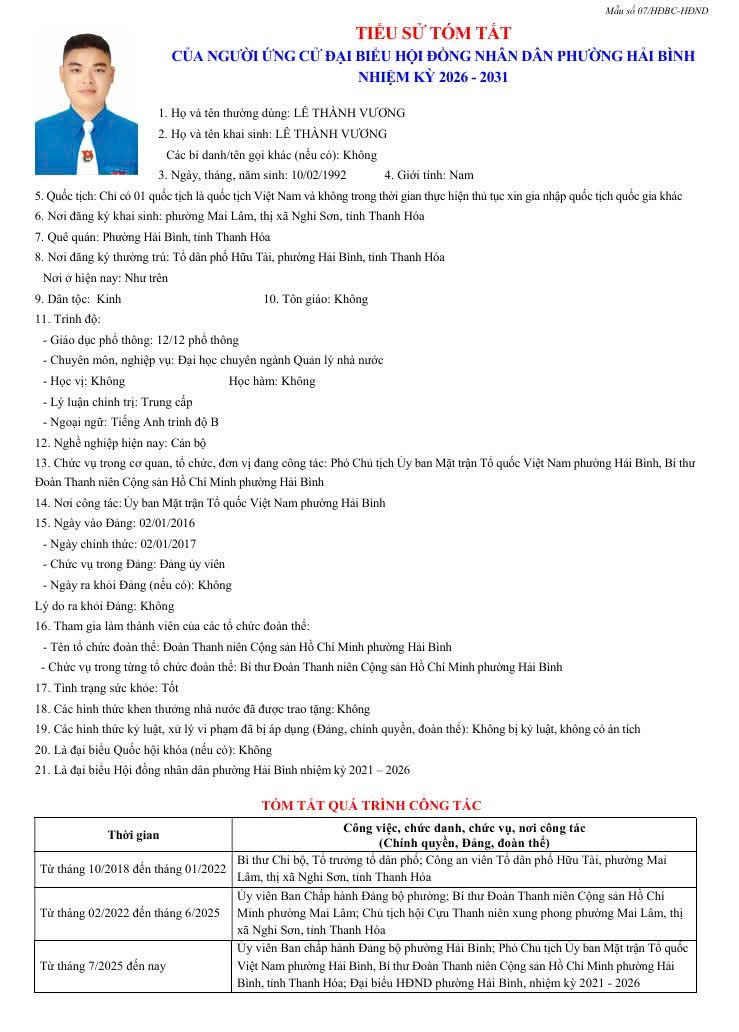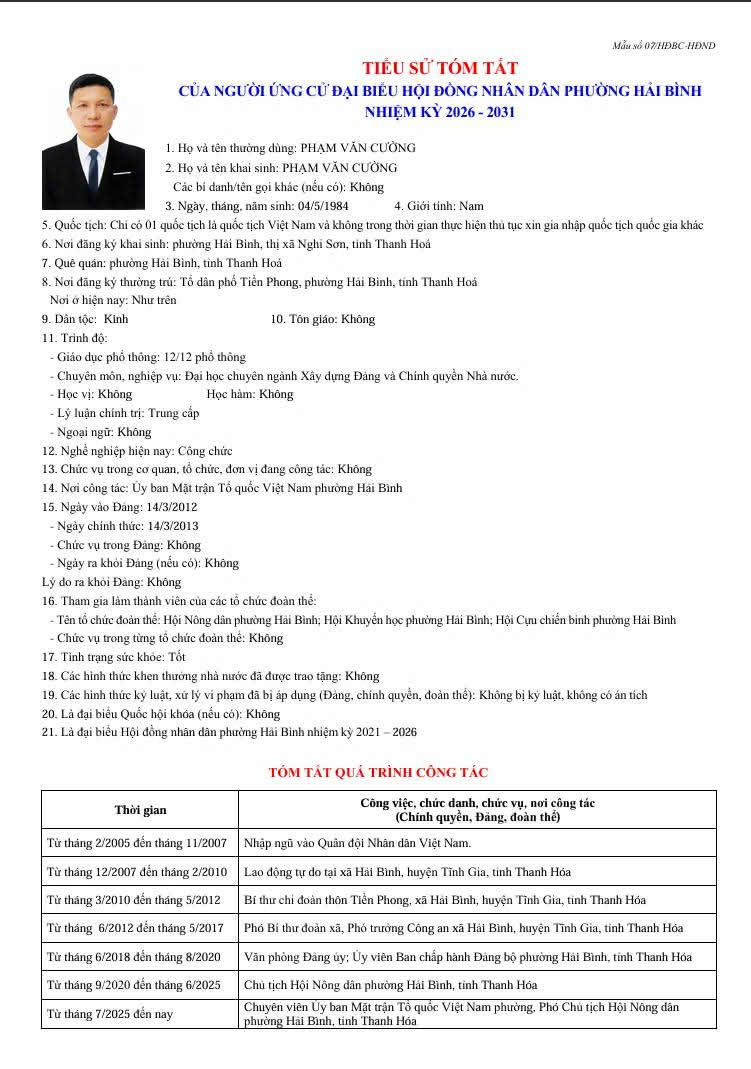 Thông tin tóm tắt Lý lịch trích ngang của các ứng cử đại biểu HĐND phường Hải Bình, nhiệm kỳ 2026 . 2031.