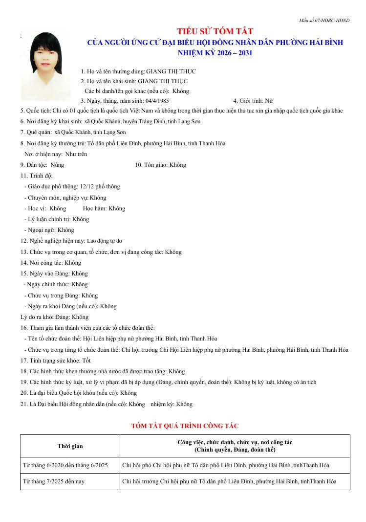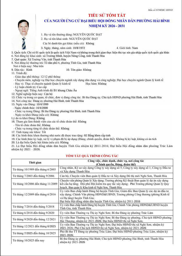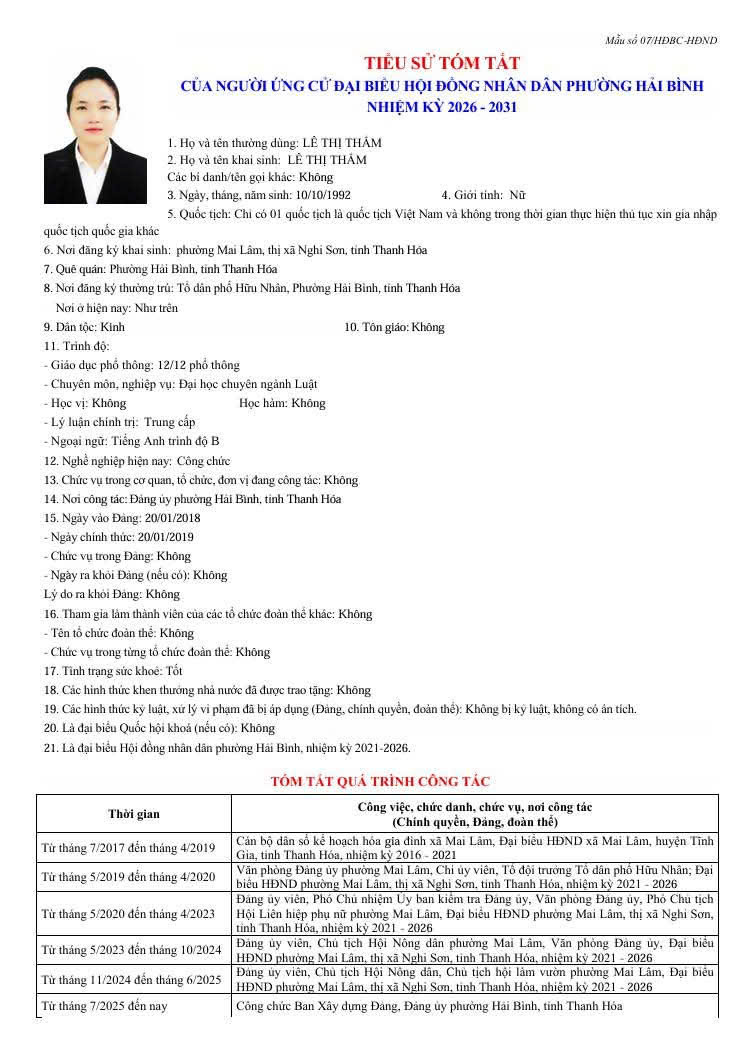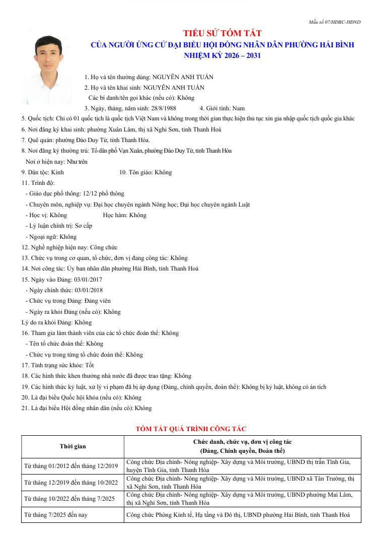 Thông tin tóm tắt Lý lịch trích ngang của các ứng cử đại biểu HĐND phường Hải Bình, nhiệm kỳ 2026 . 2031.